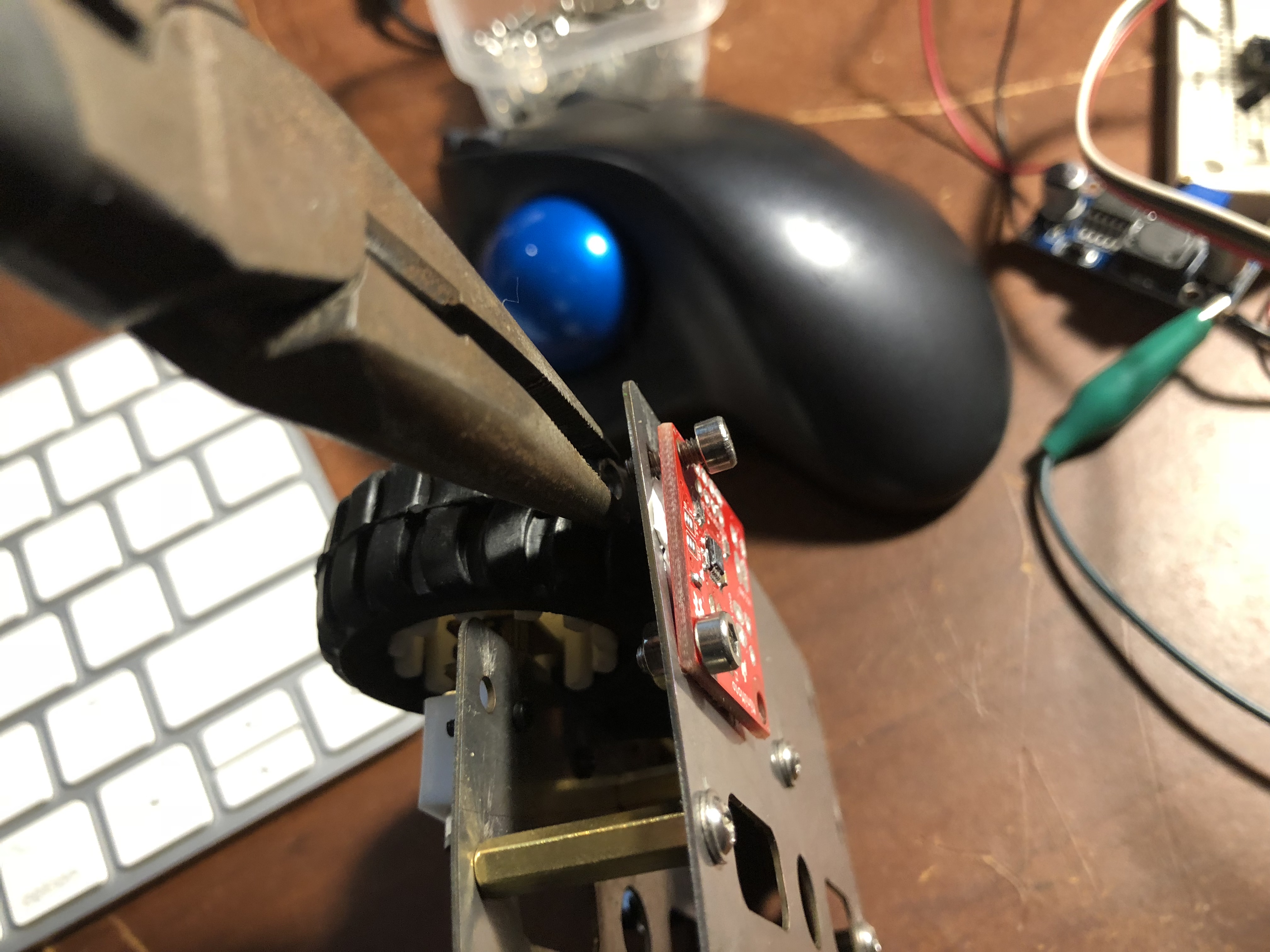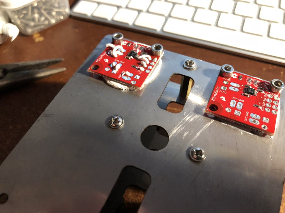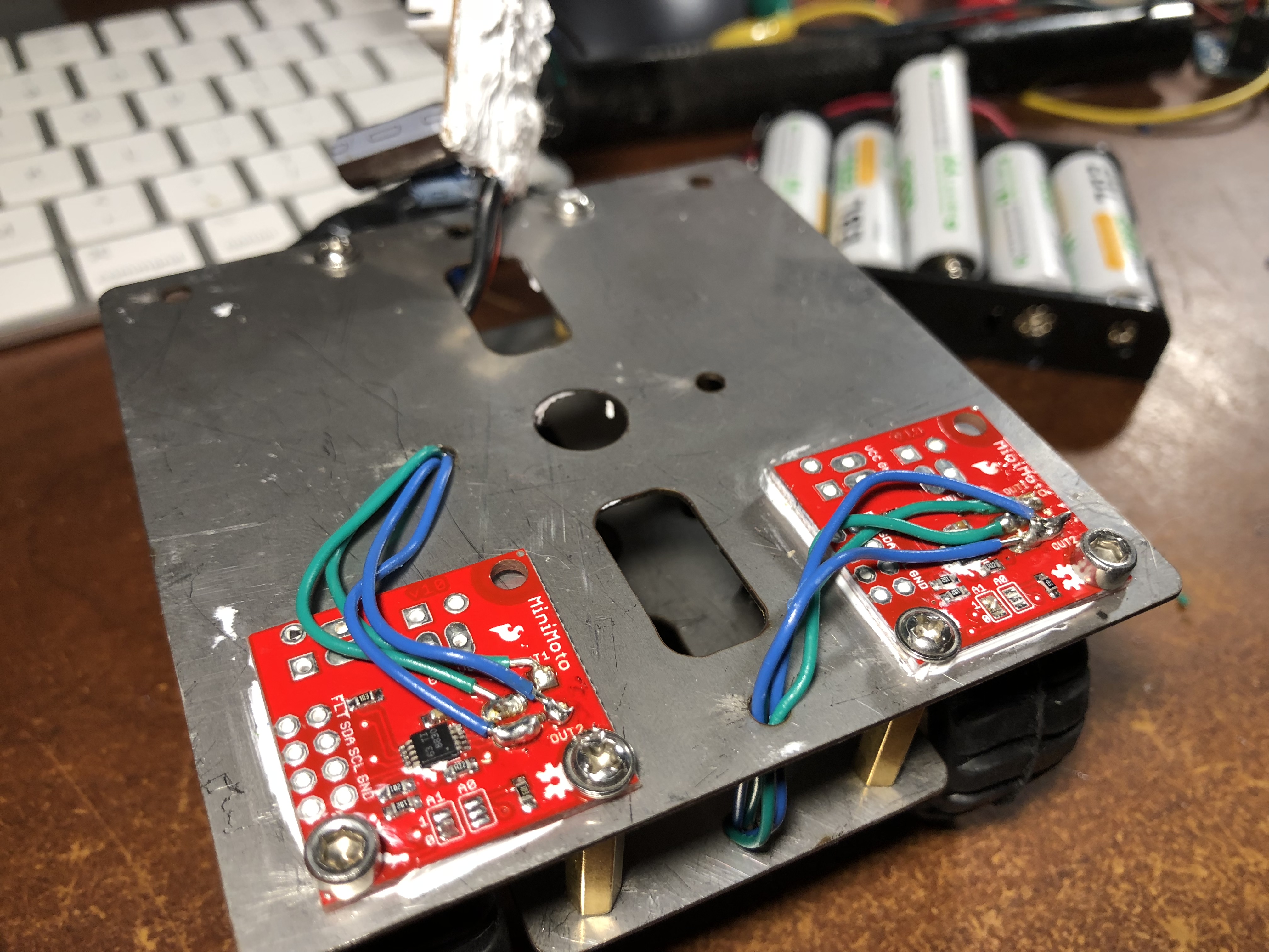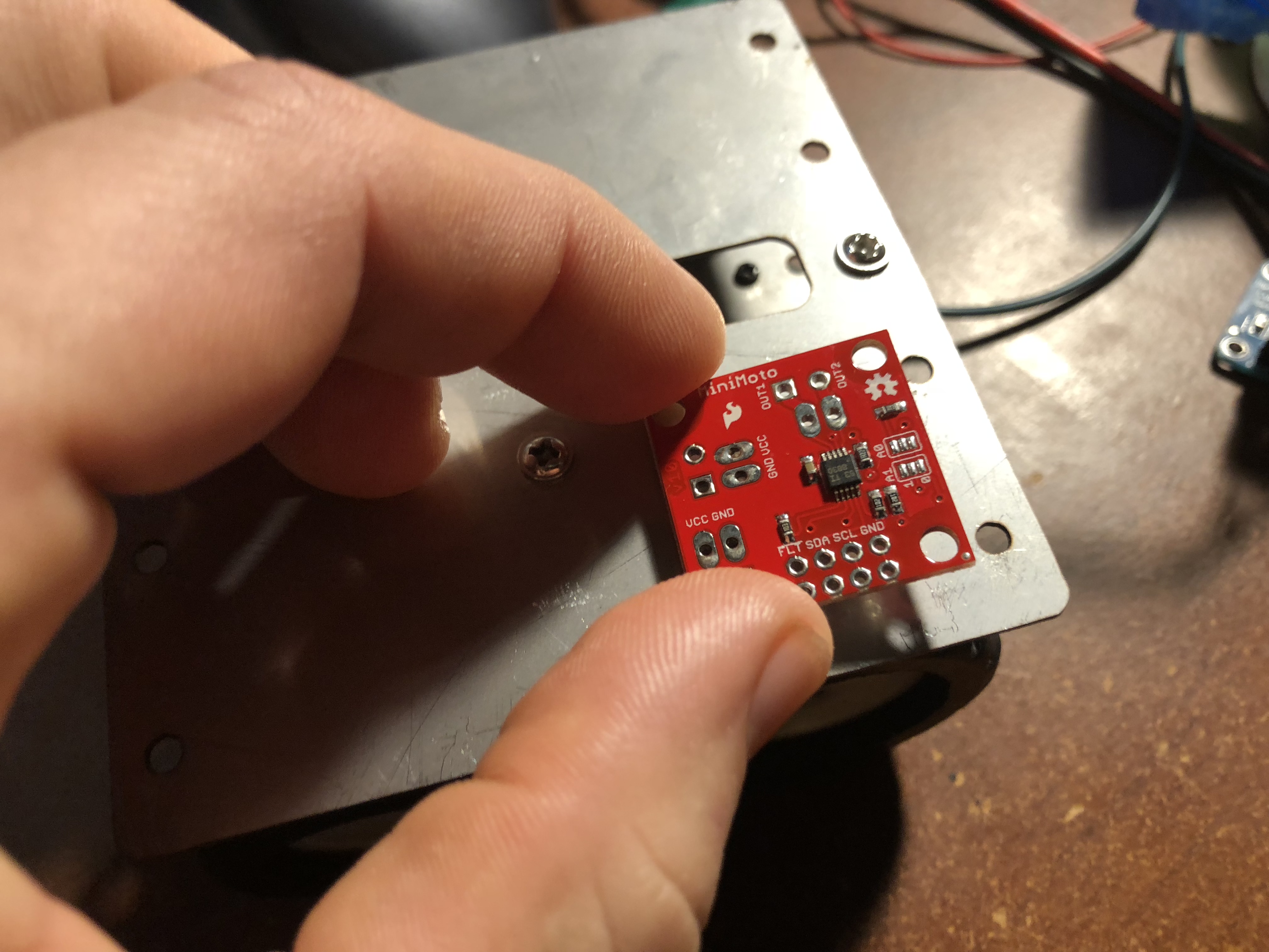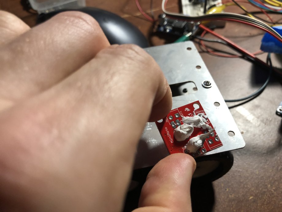 I've had some thermal paste lying about for years--it works nicely as an adhesive. Also, I was hoping to use the chassis to heatsink the motor drivers.