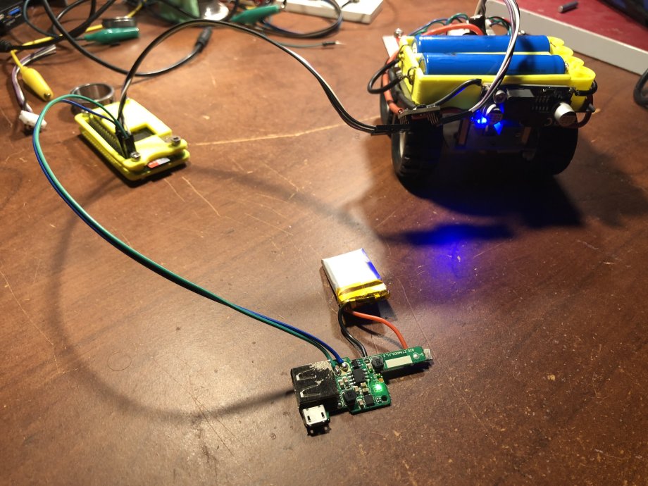 Then I remembered the load-sharing and boost converter circuit salvaged from a battery bank. The charge circuit was built for Li-Po chemistry and the only Li-Po I had lying about was a 350mA. I wired it up and was surprised the whole thing worked, with the added benefit of being able to charge the rp0w battery without disconnecting it. Booyah!