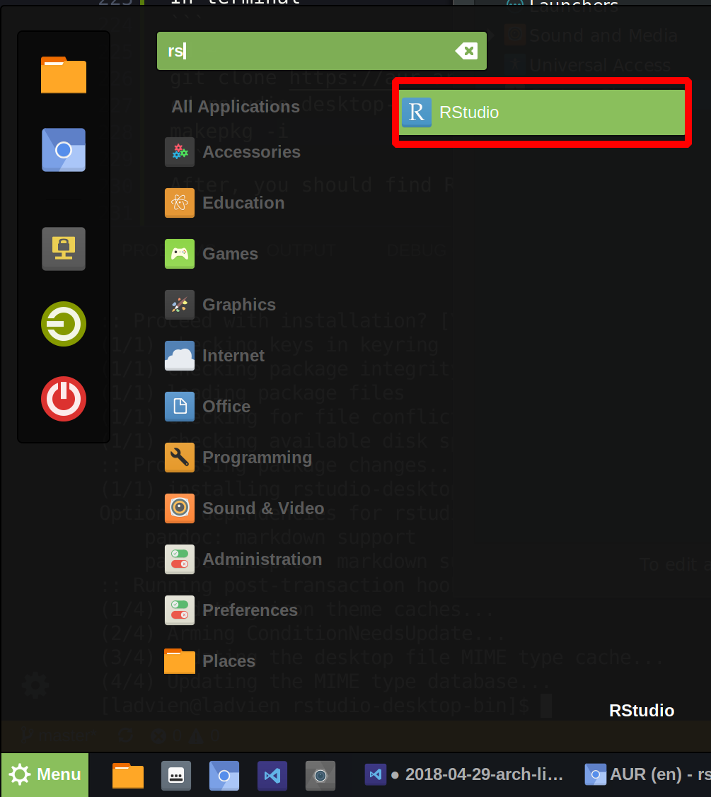 After, you should find RStudio in the Antergos Menu.