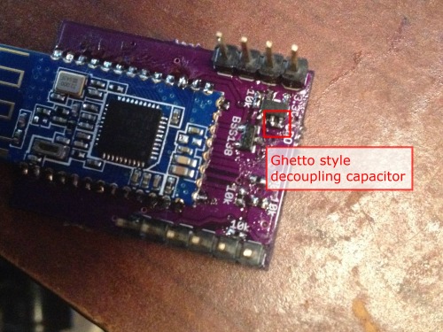 I expect one major mistake and two minors on the first run of every board I send off. This board is no exception. I forgot the decoupling capacitors on the voltage regulator and the HM-10. I've added them on the v.02 board. Of course, this shouldn't be a major flaw, but with a capacitor on the voltage regulator it causes it to spit out 3.6v instead of 3.3v. Major problem. I saved this set of boards by soldering a 0402 1uF between the legs of the SOT-23-5 regulator. Not fancy, but saved $5.