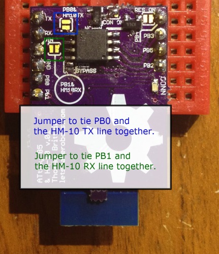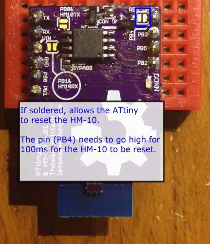 The last solder jumper controls the HM-10's reset. If soldered, the ATtiny 85 can reset the HM-10 by sending PB4 high for ~100mS. I added this as I hope to create a star-network with the ATtiny Bitsy Spider.