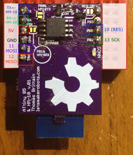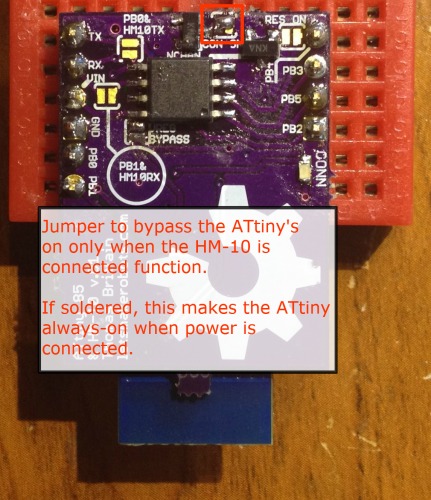 When done, the ATtiny 85 will only power-up if the HM-10 has a connection. Of course, the solder-jumper is meant to bypass this feature.