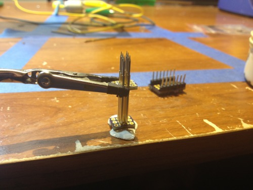 It was not too hard to put together, I set it up something like this. Then, it is all about added flux to where the pins meet the PCB and soldering like you would usual header pins.