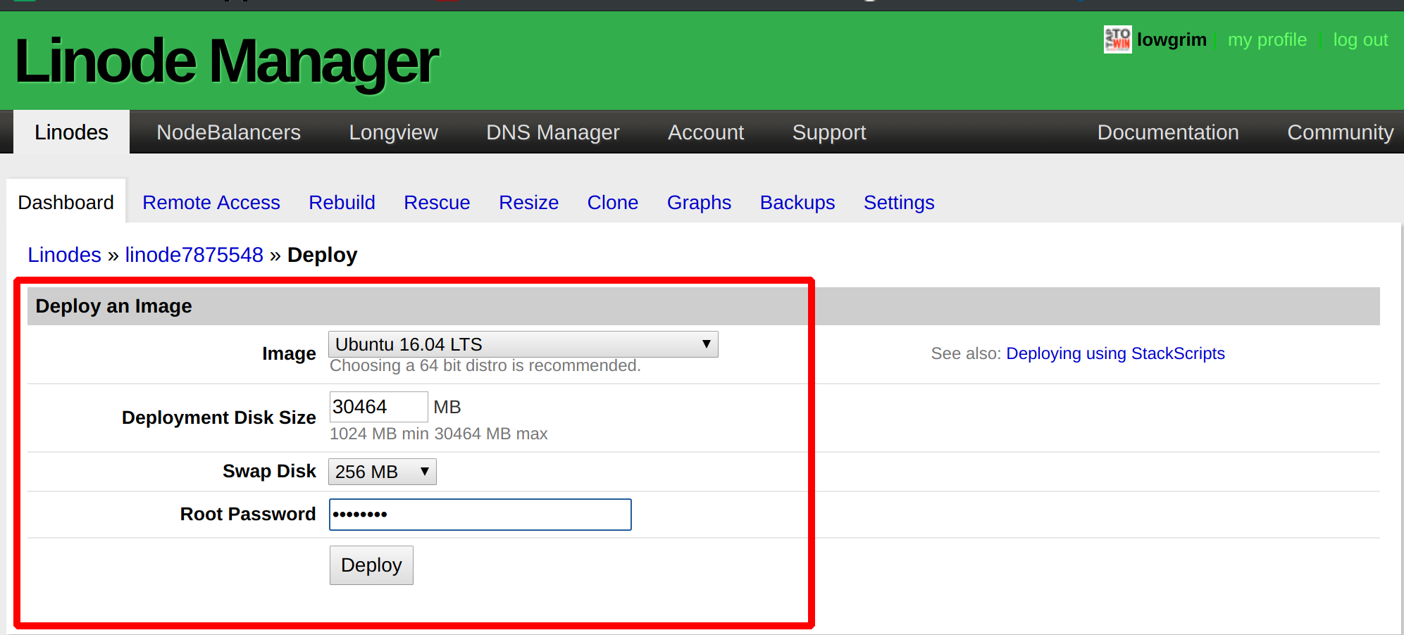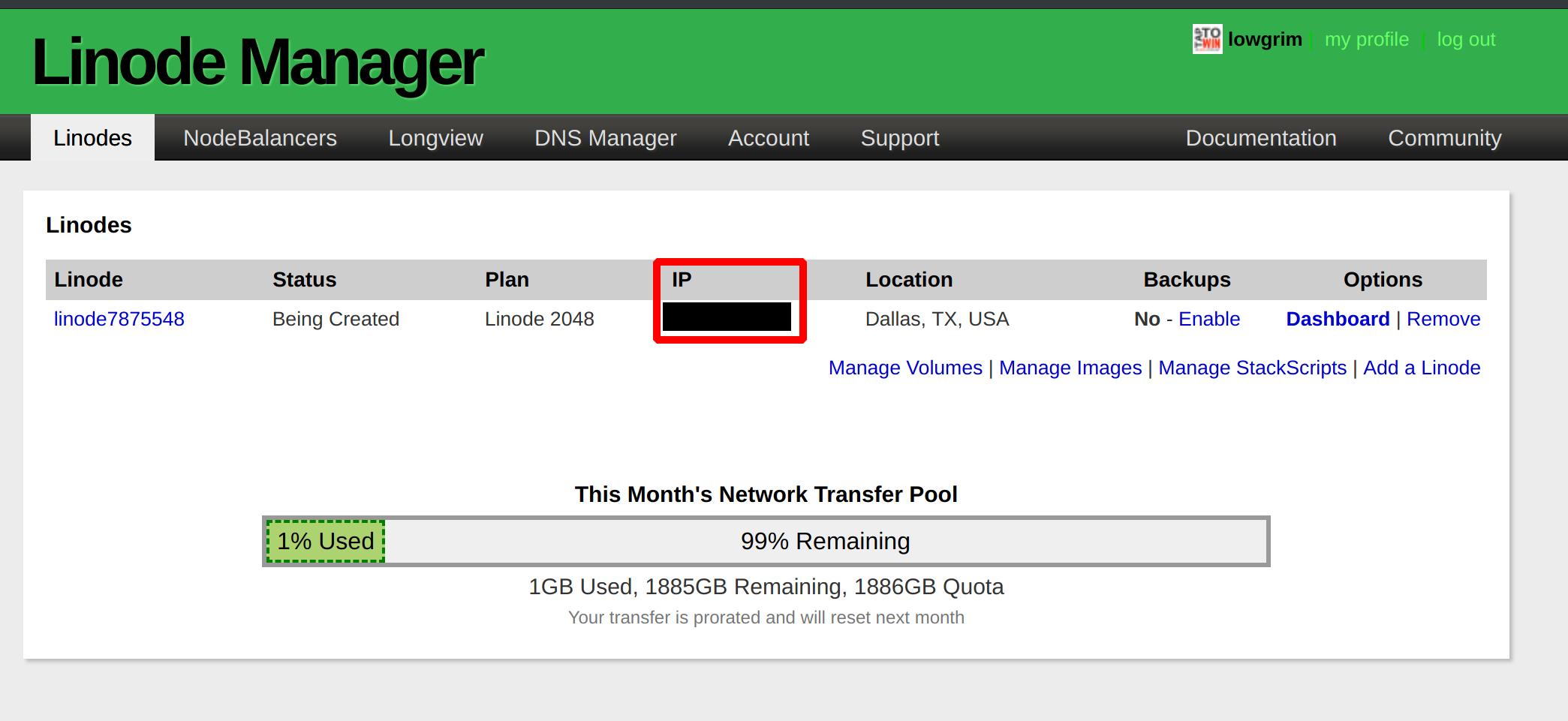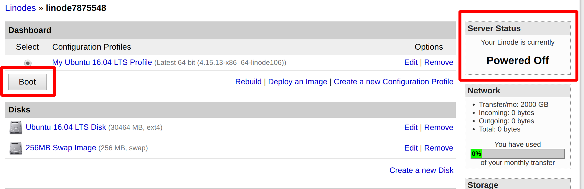 Ok, let's fire up your machine. Open up the Linode dashboard and click on your linode's name. At the top right there be a box called