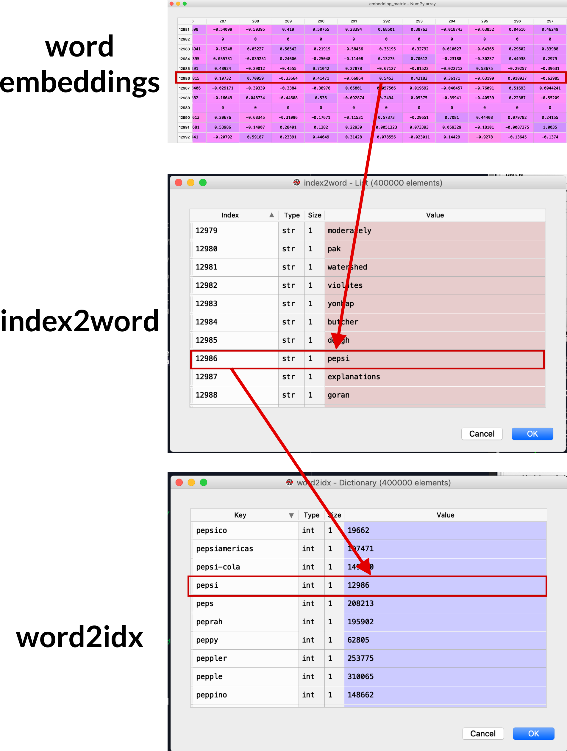 - Load the word-embeddings. These are pre-trained word relationships. It is a matrix 300 x 400,000.