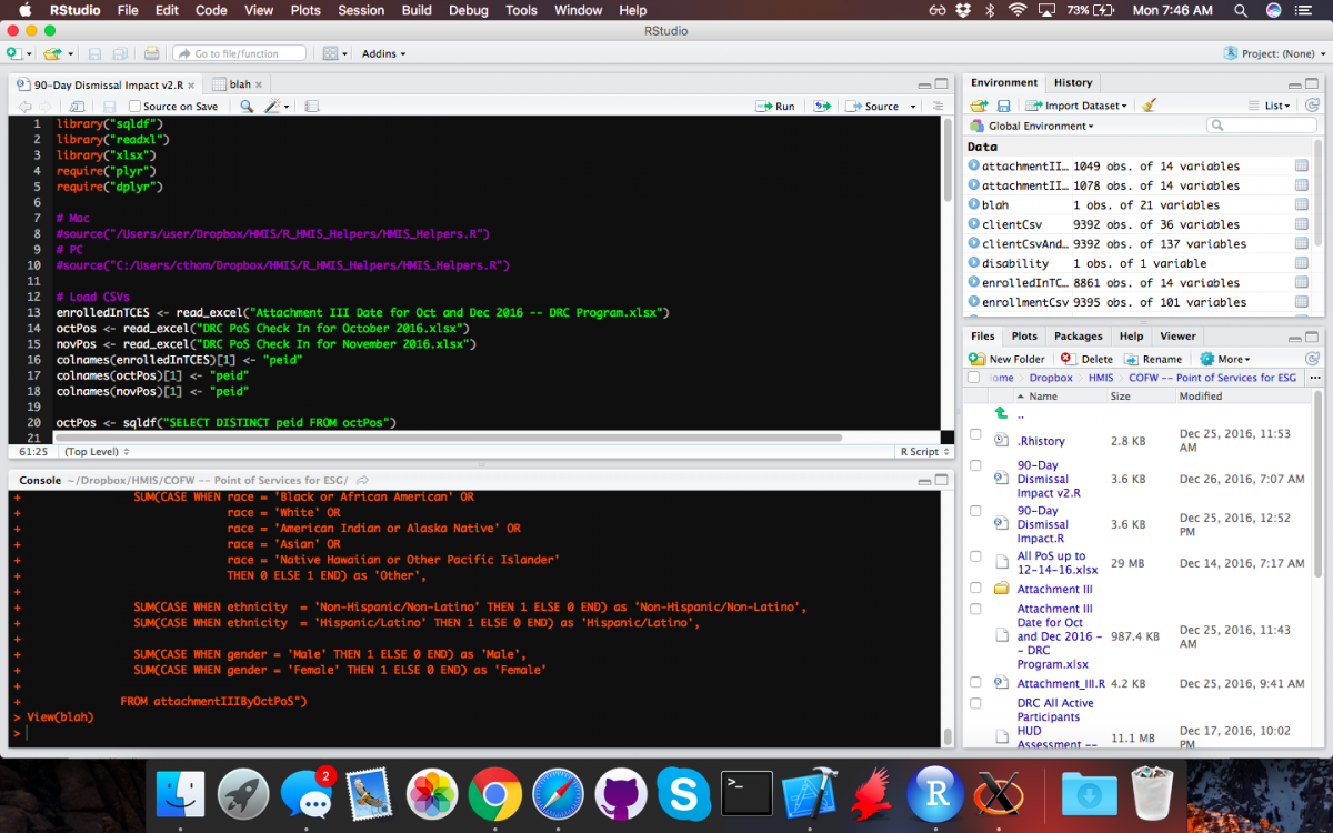 I'm a HMIS Database Manager for a living. It's a dream job--all the nerdy stuff, plus, there is a possibility I'm helping people. Currently, one area our software really lacks is quickly generating complex reports. It has the ability, but the servers are laggy, it crashes often, and a project which should take 20 minutes will take 50 minutes to 40 hours depending on the "report weather." These issues are probably caused by the reporting platform being web-based and calculations done server-side. Regardless, given the amount of time the staff are eating on report projects I've decided to explore alternative systems for generating some of our needed reports.