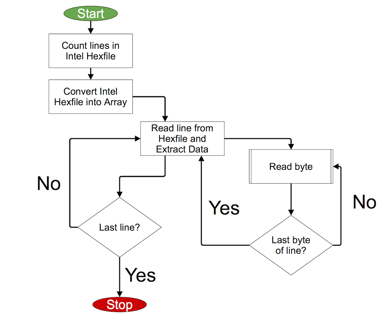 - 23: We pass hex_file_to_array a file pointer and pointer to an an array. This function reads the hex file, parses it, extracting the data and placing them into the the uint8_t array based on the data's address found in the hexfile. The function then returns the number of data bytes found in the hex file.