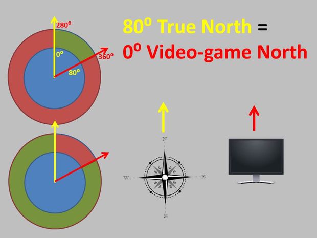 - The robot, with a one time human calibration, translates true North to "video-game north," aka, top of PC's screen.