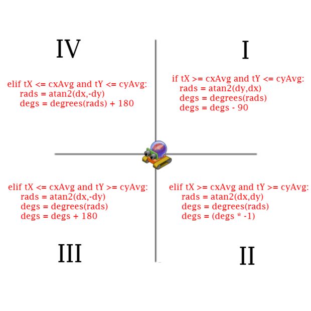 156-177: Here we are trying to find the angle between the robot and his target. We basically divide the entire screen up into four quadrants but always using the robot's centroid as the point of origin. We then calculate the slope between the target's X and Y ( tY , tX ) and the robot's X and Y ( cxAvg and cyAvg ).