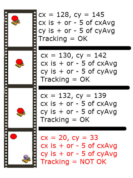 Here we lock onto the mass we believe is the robot. It begins by collecting a 150 samples before it will state is tracking the largest mass. But after it begins to track the largest mass, then we try to stay locked on to it. This is line 122-127. In essence, we allow the mass to move enough to be considered a movement by the robot, but not so much that noise (like a stray hand in the webcam image) will cause the tracking to switch off the robot.