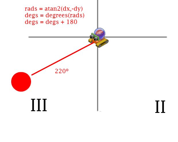 181: When we find the angle between the robot and the target, then convert it into degrees, it ends up giving us a number which is a float . That's more than we need, so here we convert the float ( degs) to and integer (targetDegs) so we can compare to the robot's compass heading.