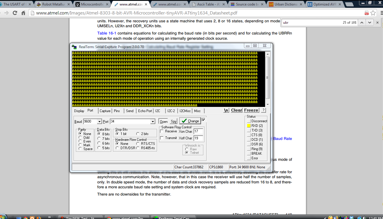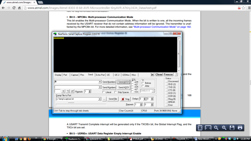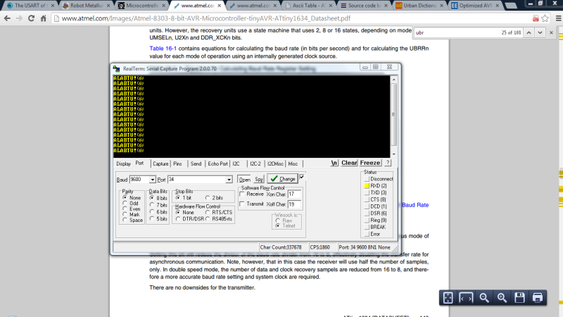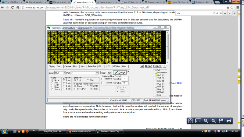 After reading the articles I opened up the ATtiny1634 datasheet and decided I would start by trying to output "ALABTU" to a serial-port into Real Term .