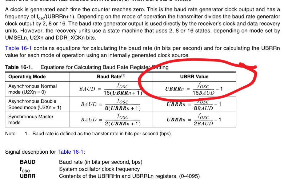 Line 10: This creates a macro for the UART Baud Rate Register (UBBR). This number can be calculated using the formula on page 148 of the datasheet . It should be: UBBR = ((CPU_SPEED)/16 DESIRED_BAUD)-1. For me, I wanted to set my rate to 9600, therefore: UBBR = (8,000,000/16 9600)-1; Or: UBBR = (8,000,000/153,600)-1 = 51.083. It can have a slight margin of error, and since we can't use a float, I rounded to 51.