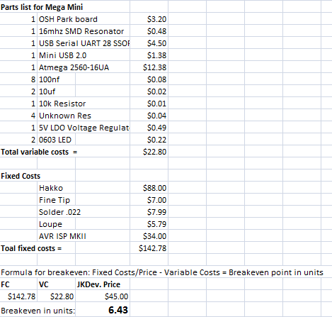- If you plan on making fewer then around 7 boards, it is not cost effective to make them yourself. JKDevices sell them for $45.00 and the break even point by my calculations is 6.43 (see chart at bottom). I hope that doesn't discourage anyone. Price is only one way of looking at it. I cannot put a price on everything I've learned in the process.