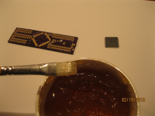 I had read somewhere when populating a SMD you should start with the largest component and work down to the smallest. That's what I did. I started by trying to pin the Atmega chip to its pads. In the end, I used the dragging tip method with plenty of solder flux.