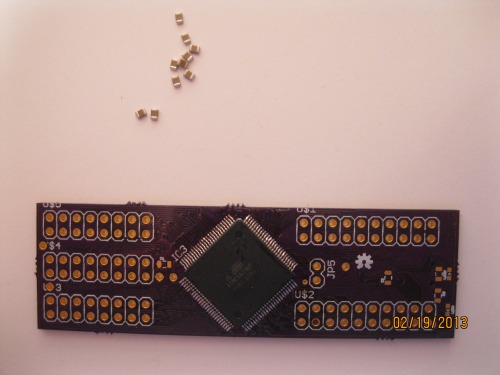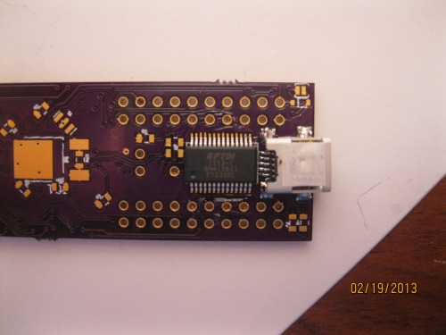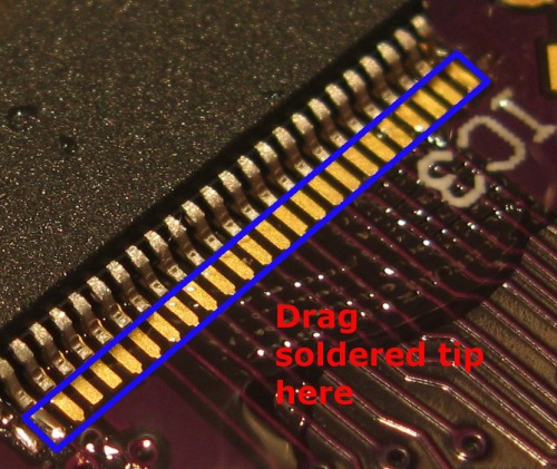 I put the board on my helping hands and after a lot of flux and around 45 minutes; I learned how to tack the corners with a little solder and then use the drag and drop method. I believe that .022" solder is key here. It allowed me to better control the little solder it takes to connect the pads. One thing I noticed, when using the drag across method, put the solder on your tip and just touch the edge of the pad, not the leg of the pin. As long as your iron is hot enough, the solder will flow on its own up the pad based on the meniscus effect .